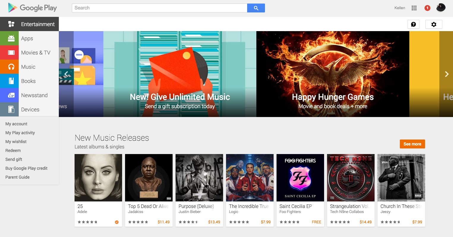 On a related note, the web version of Google Play is also getting a mini-makeover to match thee new mobile app version. The Google Play web store is now defaulting to an “Entertainment” section, with sections dedicated to music, movies, books, comics, etc. instead of apps and games like it used to. In order to access apps, you have to slide over and click the “Apps” button on the left side.