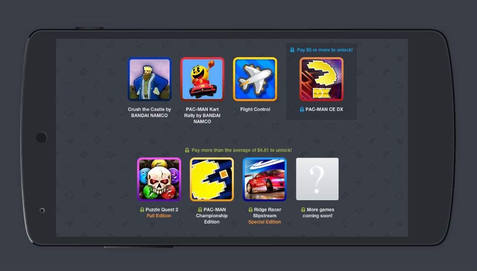 At this time, the price you need to pay to unlock all of the games is just $4.80, netting you a total of 6 games, plus more to come. The games included are Crush the Castle, Pac-Man Kart Rally, Flight Control, Pac-Man Championship Edition, Puzzle Quest 2, Ridge Racer Slipstream. If you pay an even $5, you also unlock Pac-Man CE DX. If you pay under the average, you will receive the first three games previously mentioned.