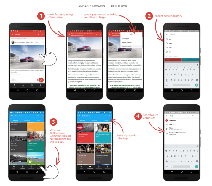 As detailed by Googler Luke Wroblewski, the app now utilizes Chrome custom tabs to preload web sites when they are linked to inside of a Google+ post. This allows web sites to load much faster. Not only will speeds be increased, but other features like saved passwords, autofill, and Tap to Search are also available in custom tabs.