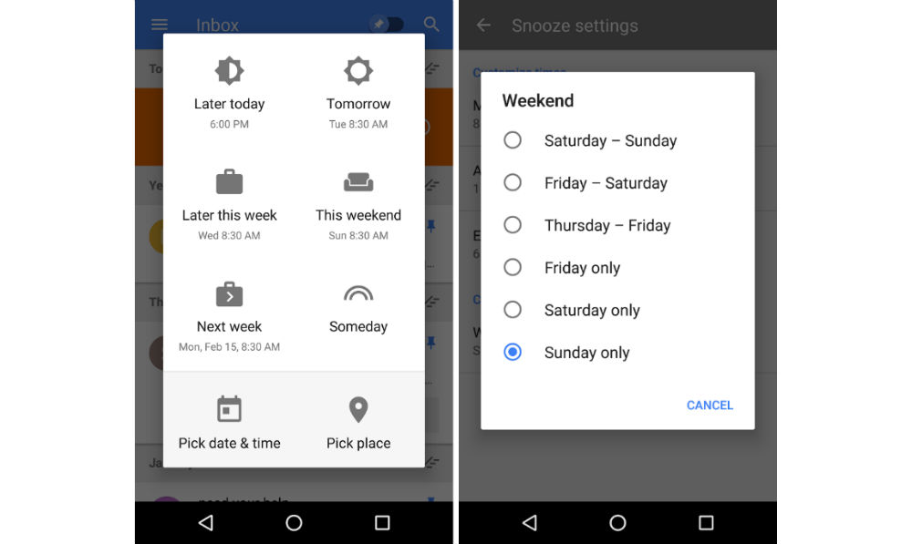 An update is rolling out to Inbox, filled with useful tweaks for the Snooze functionality inside of the app. Once updated, users will be able to select between two new snooze times, Later This Week and This Weekend. With these times added in, this should cut down on time spent choosing custom snooze times for your email.