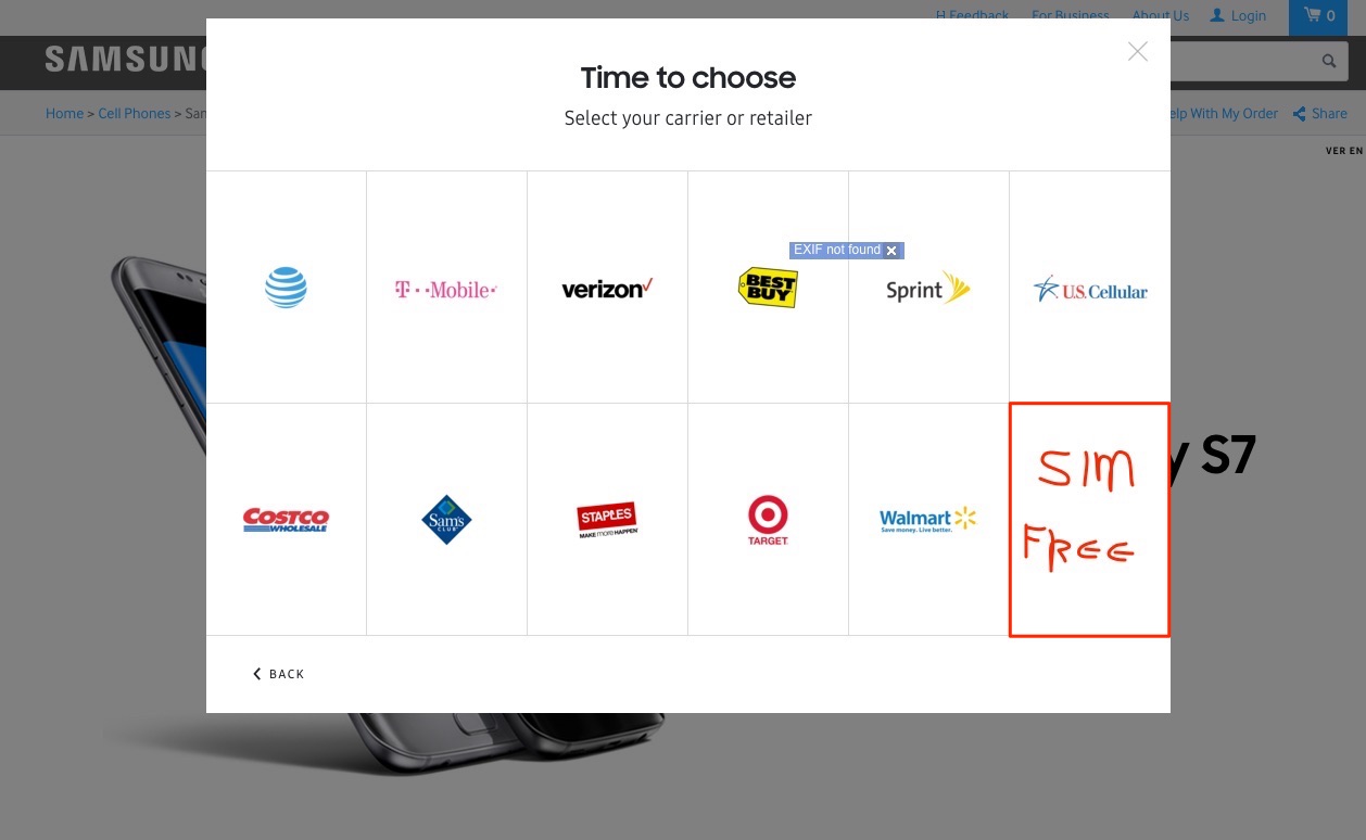 And look at this, your own website even has a sweet little blank spot in its carrier and retailer chooser where you could put “SIM FREE,” just like Apple does! How convenient. It wouldn’t be hard to do. It’s obvious that you sell international unlocked models, because some of us have to buy them through semi-shady eBay sellers and UK retailers.