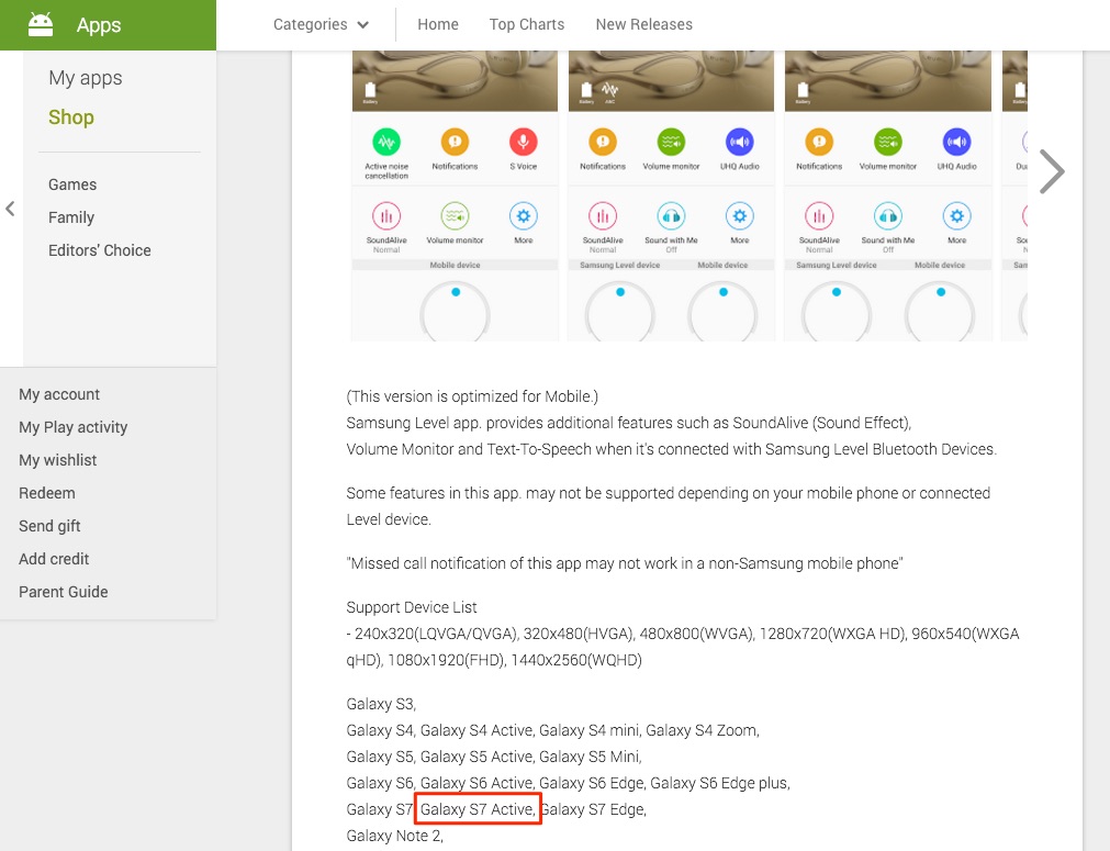 The listing (seen below) shows the supported devices list for the Samsung Level app, an app that powers the company’s Level audio products. In the devices list, you can see the “Galaxy S7 Active” is mentioned, which probably isn’t a typo unless an intern who knows nothing about Samsung was typing this out and just assumed there was already an S7 Active in existence.