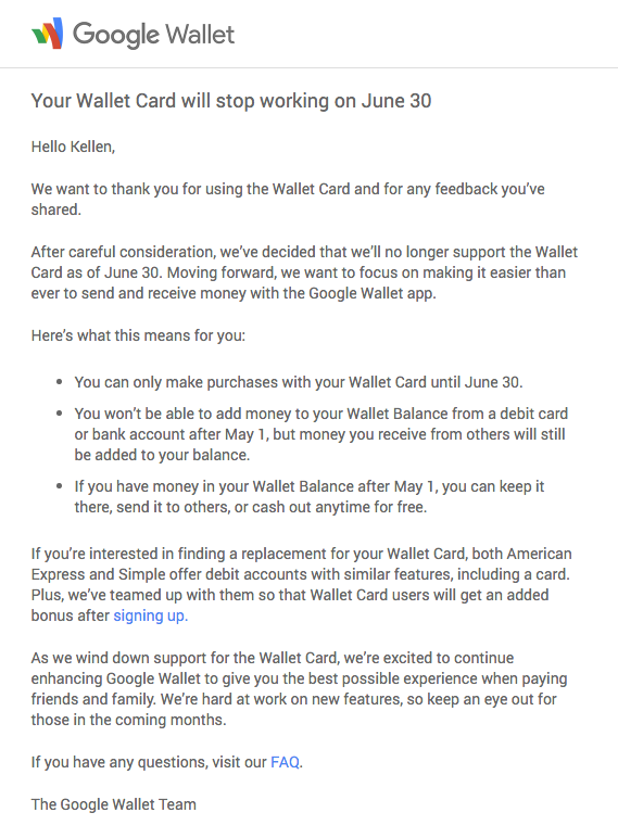 Monday’s report of the Google Wallet Card reaching end-of-life status is now confirmed. Moments ago, Google sent out emails to Google Wallet Card owners, notifying them of the June 30 stoppage, which will result in their physical Wallet Card no longer working.