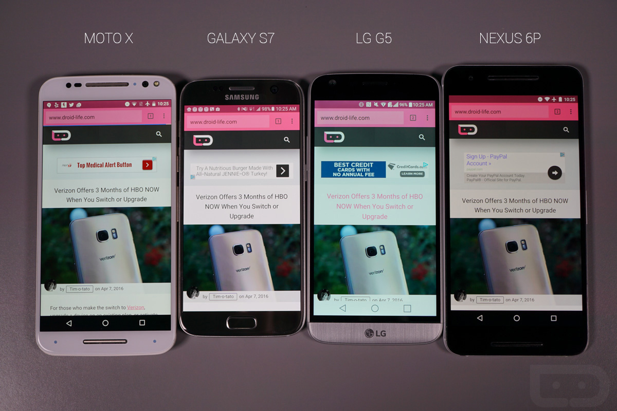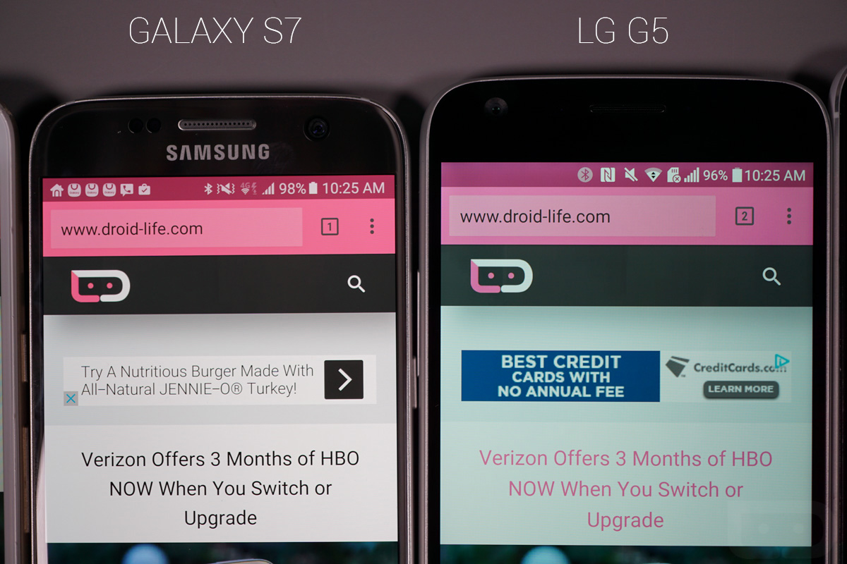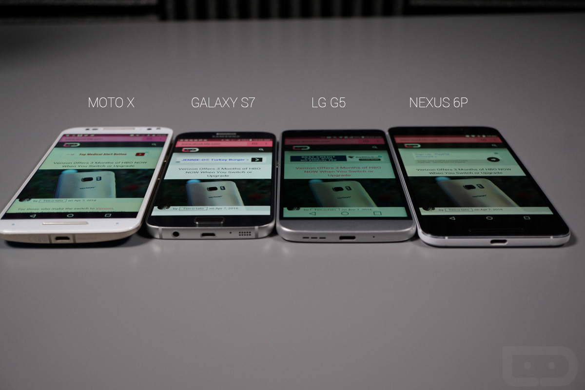 The 5.3-inch QHD IPS Quantum LCD display on the G5 is pretty average, if not borderline not-so-good. In the quick comparison to other flagships below you can really see just how washed out it makes everything with the brightness cranked up. Just look at the Droid Life pink in the tab bar compared to any of the other three phones. On the G5, it’s not even close to the pink we’re looking for and is instead a paler version. It also carries this odd green tint on top of whites, so much so that I feel like it’s tricking my eye into seeing browns in the other displays. And it’s like this on all of the G5 units I have on hand, which includes AT&T, T-Mobile, and pre-production units.