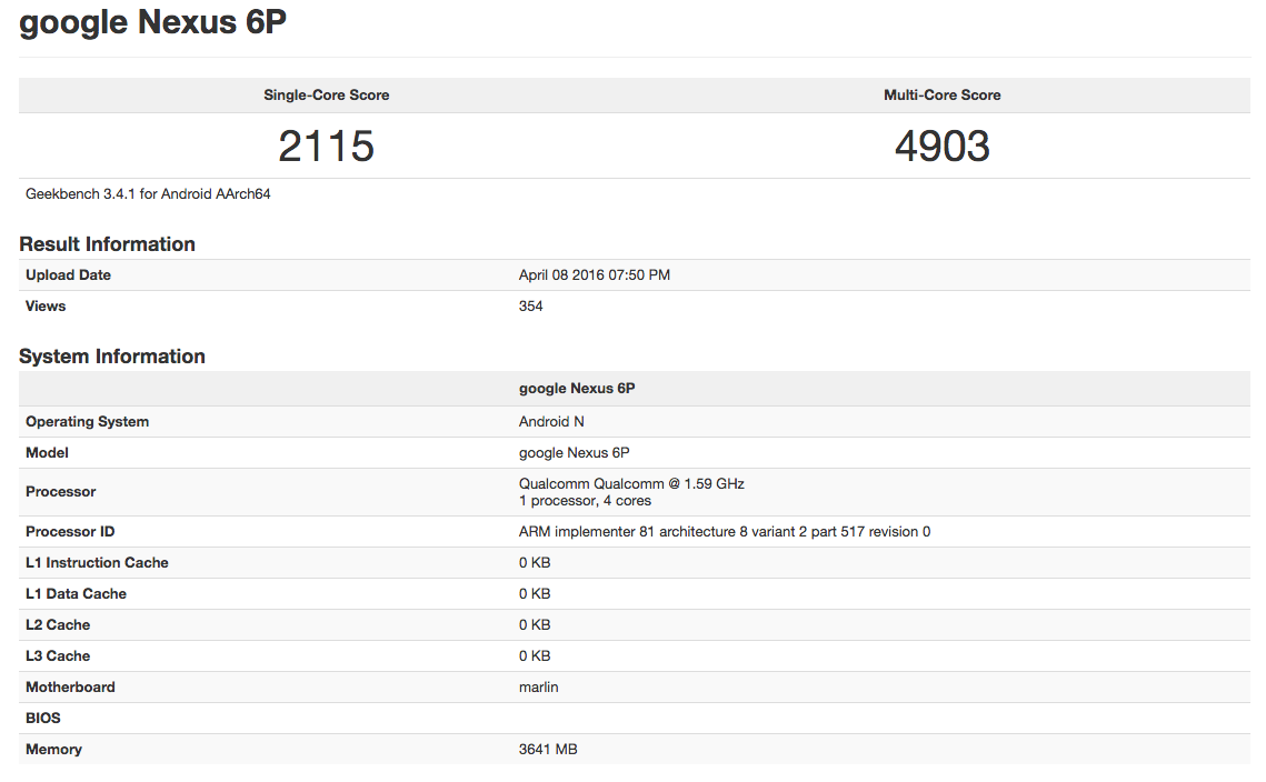 A reference to “Marlin” in an AOSP Gerrit was found back in March and this benchmark surfaced a few weeks ago. The benchmark, which refers to the phone’s motherboard as “marlin,” indicates that the phone will run a quad-core Qualcomm product (likely the Snapdragon 820) and have 4GB RAM. Yes, the page lists the phone as a “Nexus 6P,” but you and I both know that the 6P has 3GB RAM and an octa-core Snapdragon 810 on board.