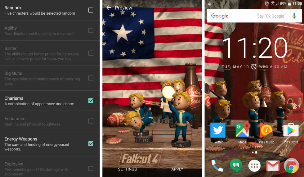 Fallout 4. It’s super legit. For fans of the franchise, NVIDIA has teamed up with the creators, Bethesda, launching a live wallpaper app of all things to Google Play. The Fallout 4 Live Wallpaper features an assortment of bobbleheads from the Fallout game, allowing users to deck out their home screen with their favorites.