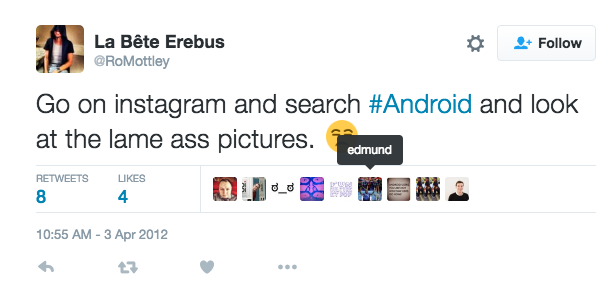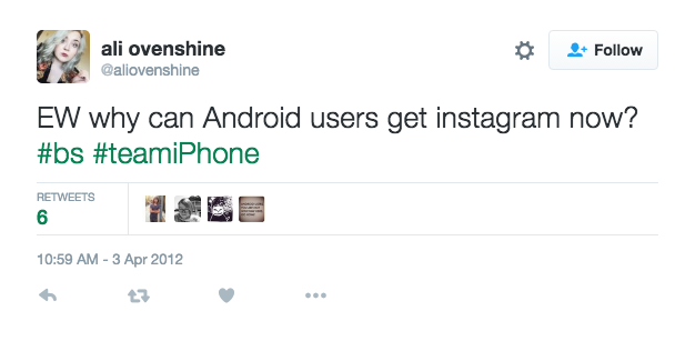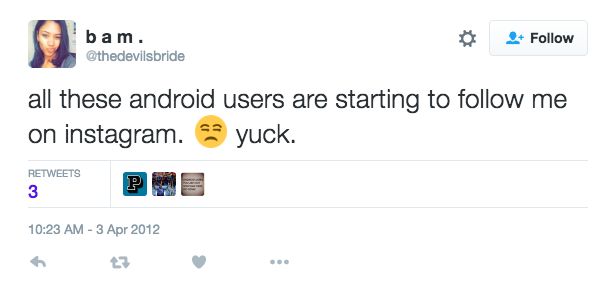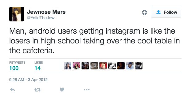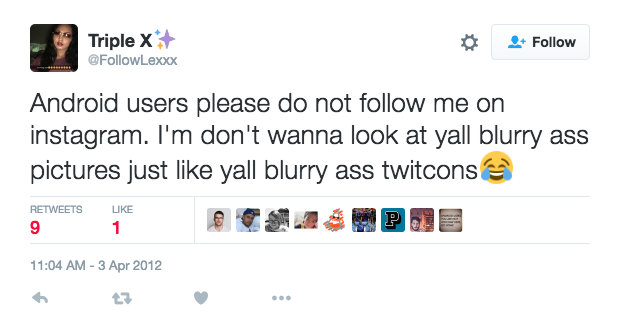 Back in April of 2012, big things happened. The walled city of Instagram was no longer exclusive to those with an iPhone, and let me tell you, existing citizens of that city were not too happy. In fact, many folks took to social media to decry Instagram’s support of Android. One comment posted to Twitter reads, “Instagram is now available for Android phones. Now I’m going to be forced to see what poor people eat for dinner.”