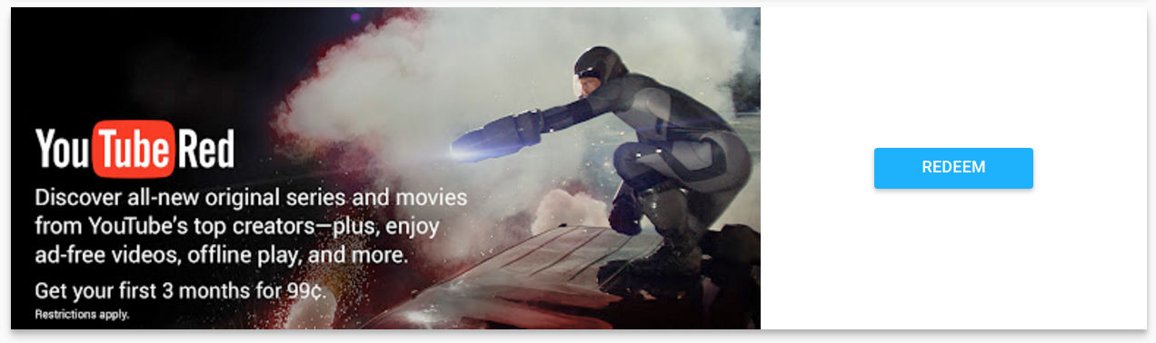 YouTube Red, the ad-free version of YouTube that also includes a subscription to Google Play Music at a price of $9.99 per month, can be had as a Google Cast (Chromecast) offer for just $0.99 for three months. At less than a dollar, I’d say signing up is probably worth the hassle if it gets you the next few months of ad-free YouTube streaming with a bonus of the Google Play Music collection on the side.