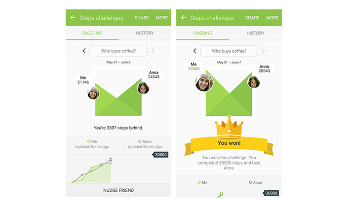 For example, to see who will buy the next round of coffee this week, challenge them to a step-off, seeing who can get through the most steps in a work week. Once a challenge is submitted to your friend, S Health will keep you up to date on your friend’s step total, and if you fall behind, the app will notify you with how many steps you will need to regain the lead.