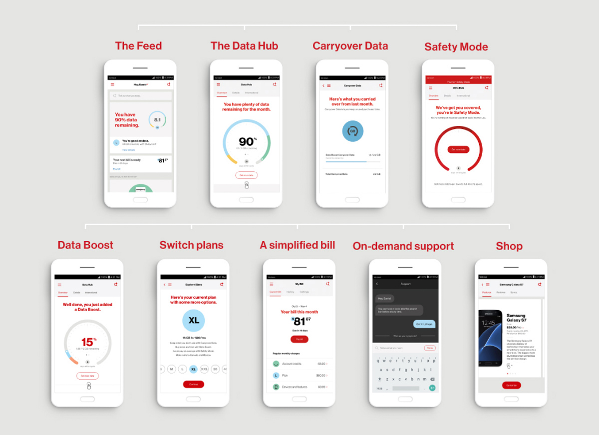 The new My Verizon app can be seen below, but they designed it like a feed you would see on a social platform. They are trying to show you everything up front, like data, account, and bill in a real-time feed, along with other “personalized products and content just for you.” There is a data hub like control center to show you how much data you are using, who is using it, and how you can get more. They also added in a shop to quickly add on new services, are providing on-demand support, and can show you a simplified bill.