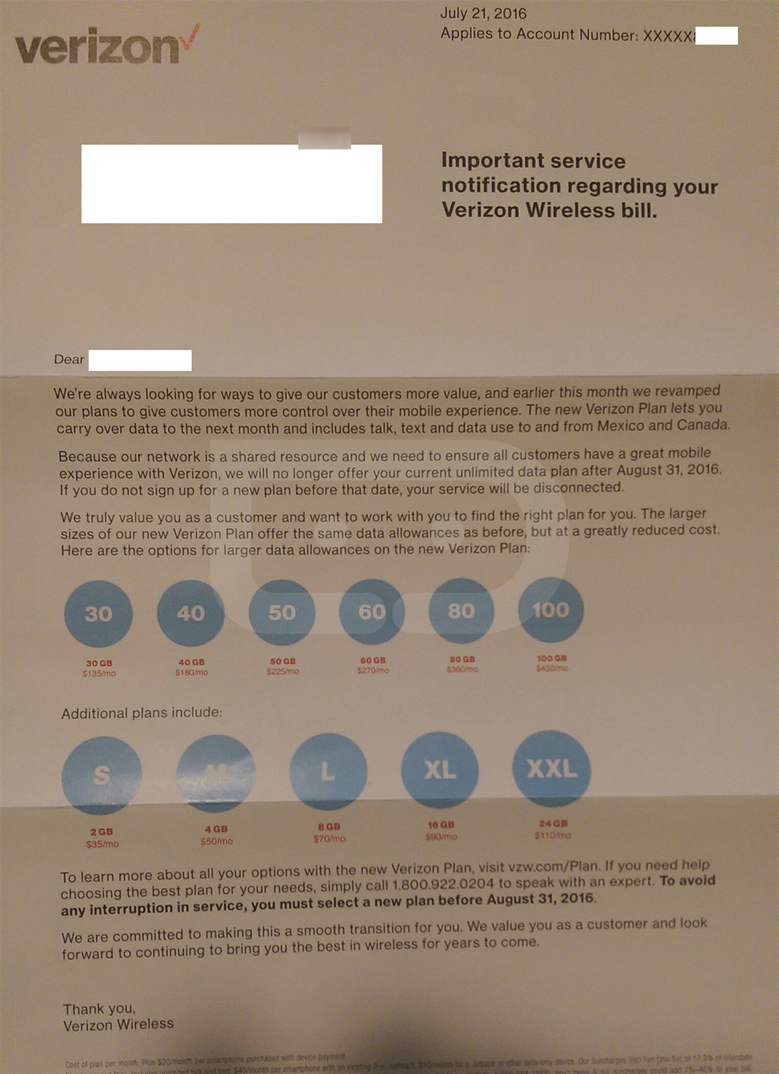 As you can see, the letters don’t actually tell the customer that they are using those “extraordinary” amounts of data and that is why they are about to lose their plan. Instead, the letter only mentions that the plan is going away for them on August 31 and they must choose something new. Since these customers are out of contract, well, that’s really all Verizon needs to do here.