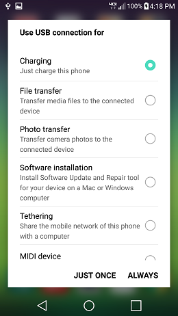 Outside of the new launcher option, G5 owners will see an updated USB connection screen that looks like this: