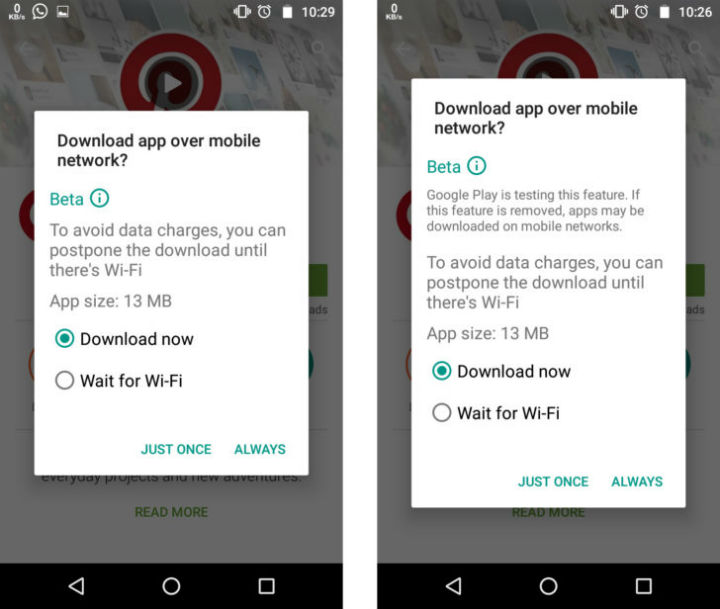 According to screenshots posted online from Android Police, at least one person is seeing a new beta feature from Google Play. The feature in testing is aimed specifically at those who download apps while on the go, something many of us probably do.