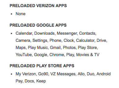 Going further, past the “Preloaded Google Apps” section, we do have mentions of My Verizon, Go90, and VZ Messages in a “Preloaded Play Store Apps” section. That likely means the apps that will be installed the minute you fire up your phone with a Verizon SIM inside. Are those three apps the end of the world? Probably not.
