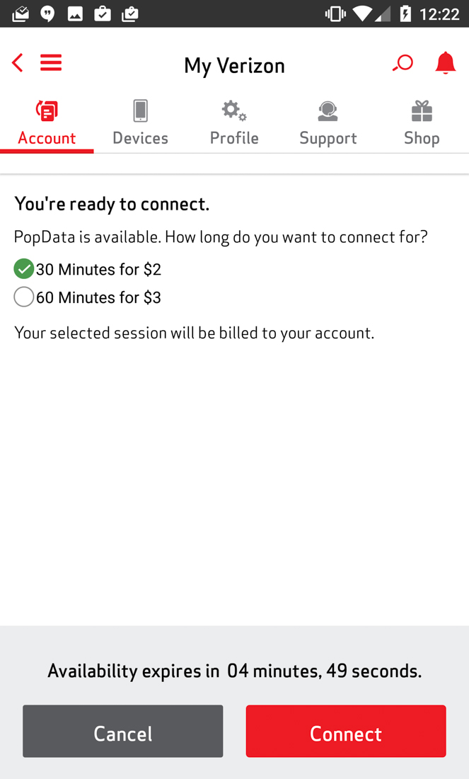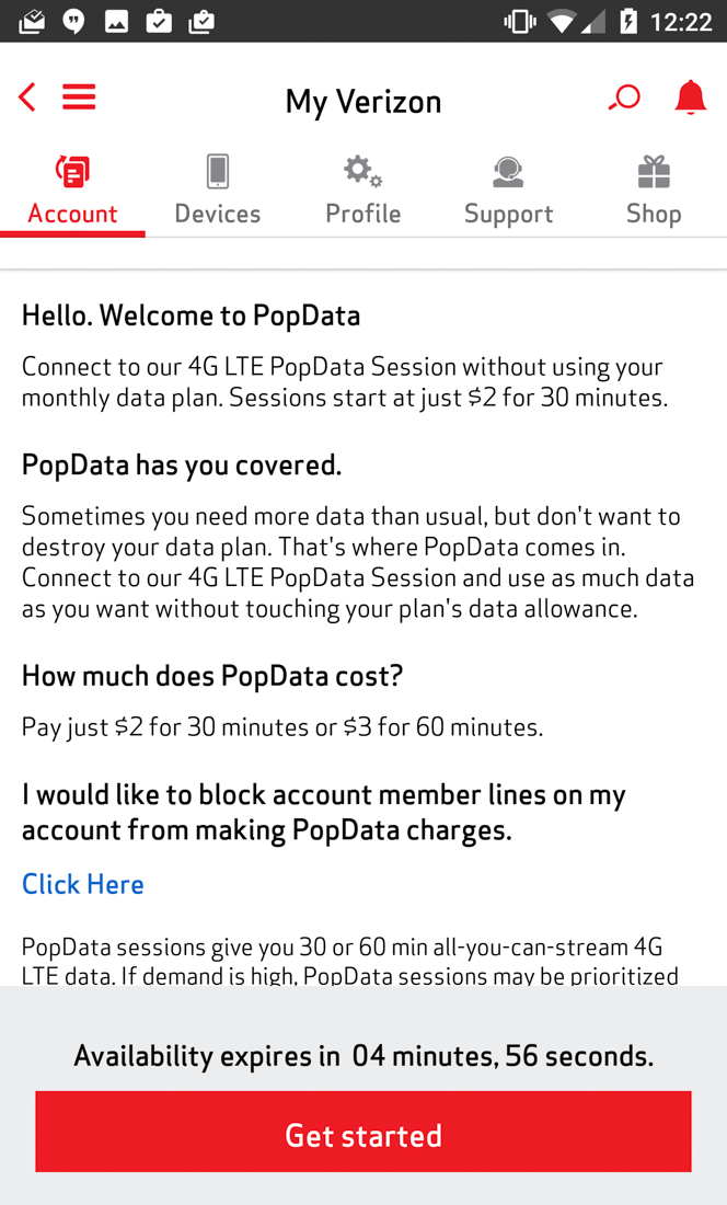 It works like this. You open the My Verizon app, scroll to the bottom to find the PopData button, tap on it, see if a PopData session is available, and then decide how long you need your PopData session to be. As of today, Verizon is offering 30 minute sessions that cost $2, or 60 minute sessions that cost $3. During those sessions, you can use as much data as is possible and it won’t count against your data plan. And that’s it. It’s that simple.