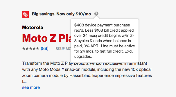This mid-range Moto Z model was originally priced at $17 per month or $408 if bought out-right. Today, the price is $10 per month, which brings the 24-month total to just $240. Verizon isn’t selling it at $240 without a contract, though, but if you do sign-up for a device payment plan while buying the Moto Z Play, you are getting one of the better phone deals I’ve ever seen.