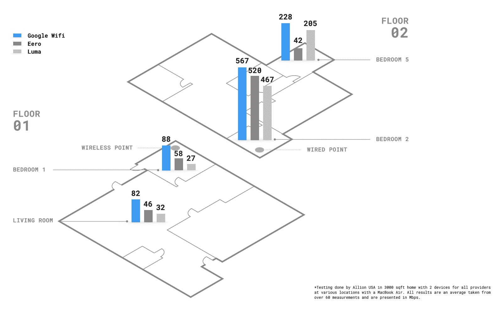 According to Google, Allion USA took two units of each system (WiFi, Luma, and Eero), placed them within a 3,000 square foot, two story house, and ran a series of speed tests (over 60 of them) in four locations. Google WiFi showed the highest speeds in all locations.