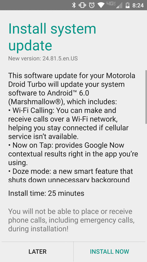 As of now, most Turbo owners receiving the update are a part of Motorola’s soak test program. However, I do believe that a few non-soak testers have also seen the update. Verizon hasn’t updated their support pages for the phone, so my guess is that this update isn’t quite rolling out to all, but should be shortly.