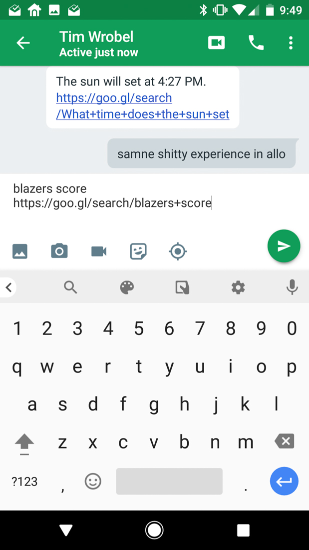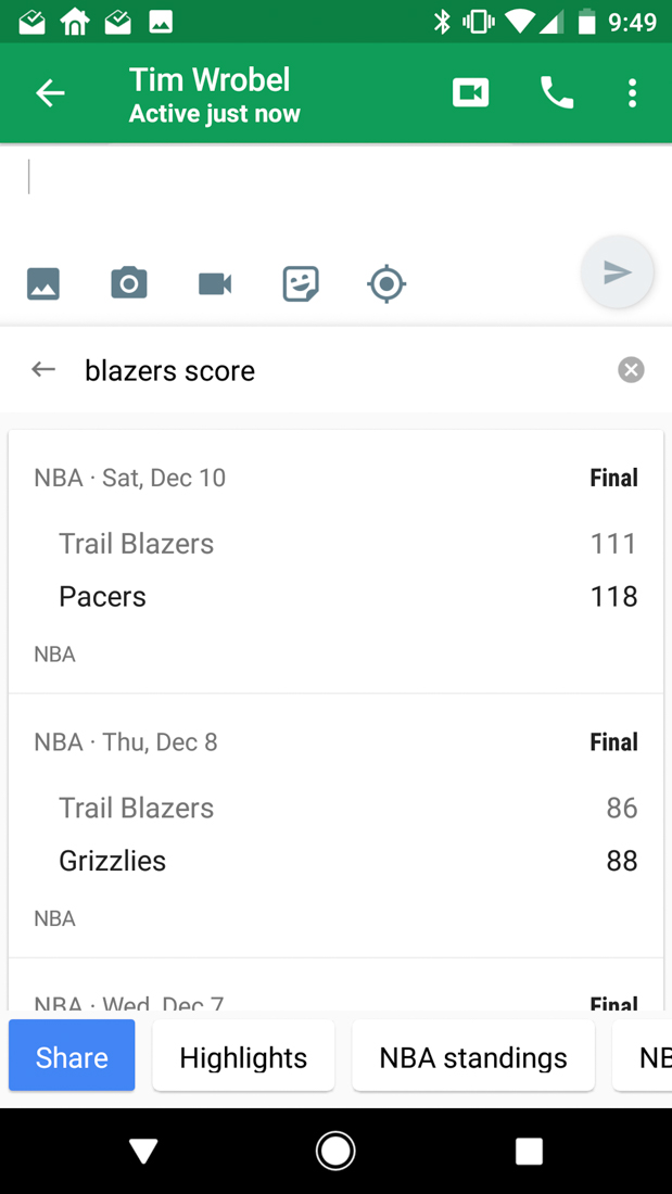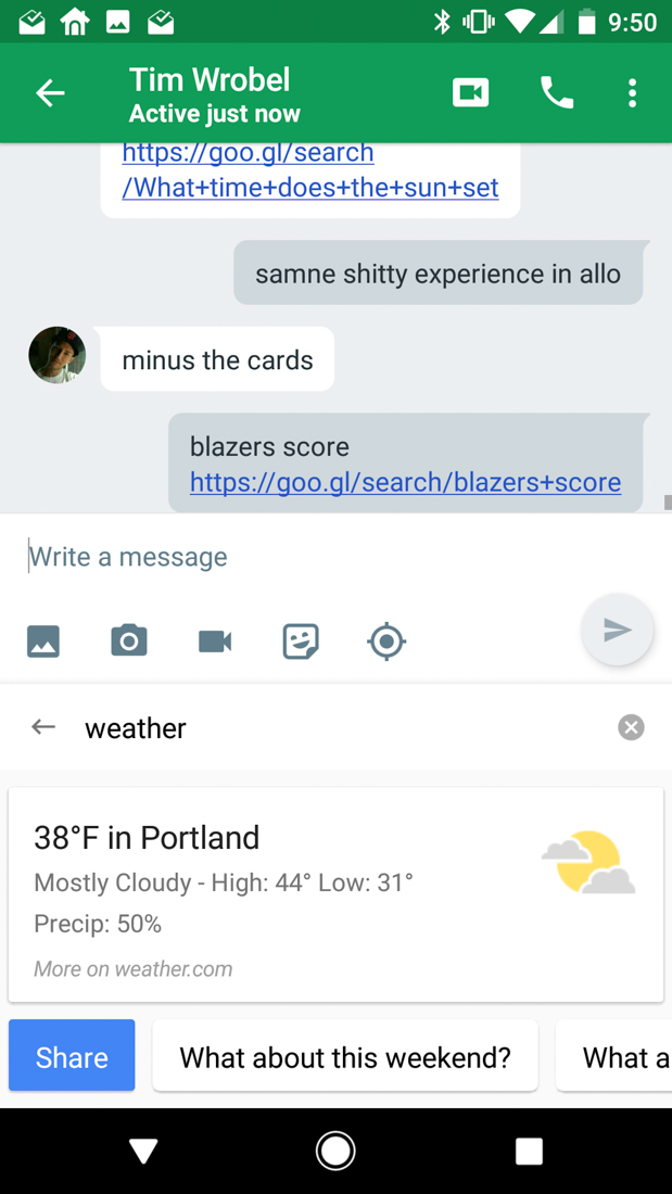 As for searching for stuff, it sure works. You just tap on the G button or pop out the menu and tap search before beginning to search for something. If you search weather or for GIFs or sports scores or flights, etc., those will return and you can quickly share them with a link and text to someone. I’ve only tested this in Hangouts, but it works, if not a bit plainly.