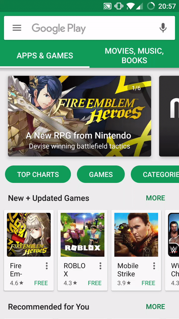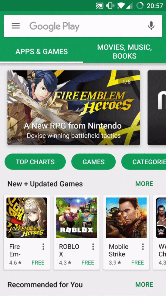 As you can see in the GIF below, the landing looks rather normal, but once you dive into “Top Charts,” the UI morphs into cards, with the interface powered by a user swiping through the various apps. The UI’s backdrop is the primary color of the app’s icon and header image, proving to be a very immersive look.