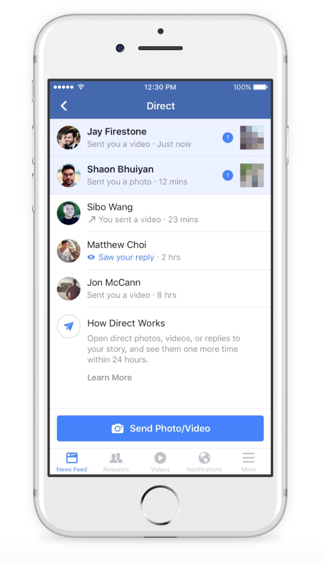 Finally, Facebook is including a new Direct sharing option as well. This allows users to send photos or videos only to specific friends or family with precision. Once those photos or videos are viewed once, a person can reply or react before they disappear. Again, like Stories, this isn’t a new idea.