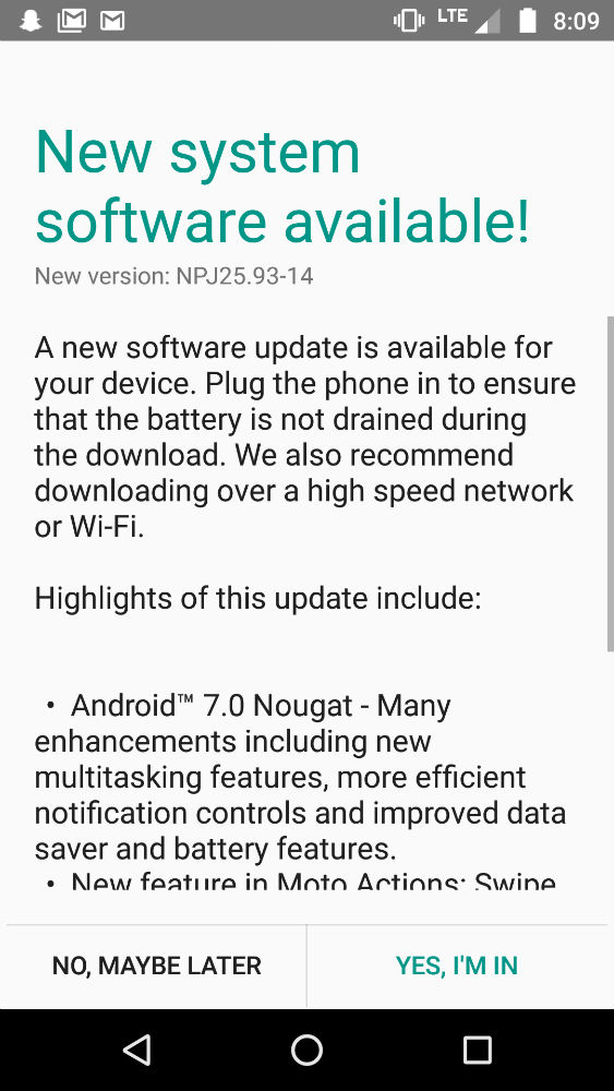 Owners of the Moto G4 (the standard model and the Amazon Prime exclusive) began receiving a prompt for an update over the weekend, bringing them up to Android 7.0 “Nougat.” If you’ll recall, we actually reported on this update in December of last year, but that was basically an error, even though the changes are the exact same.