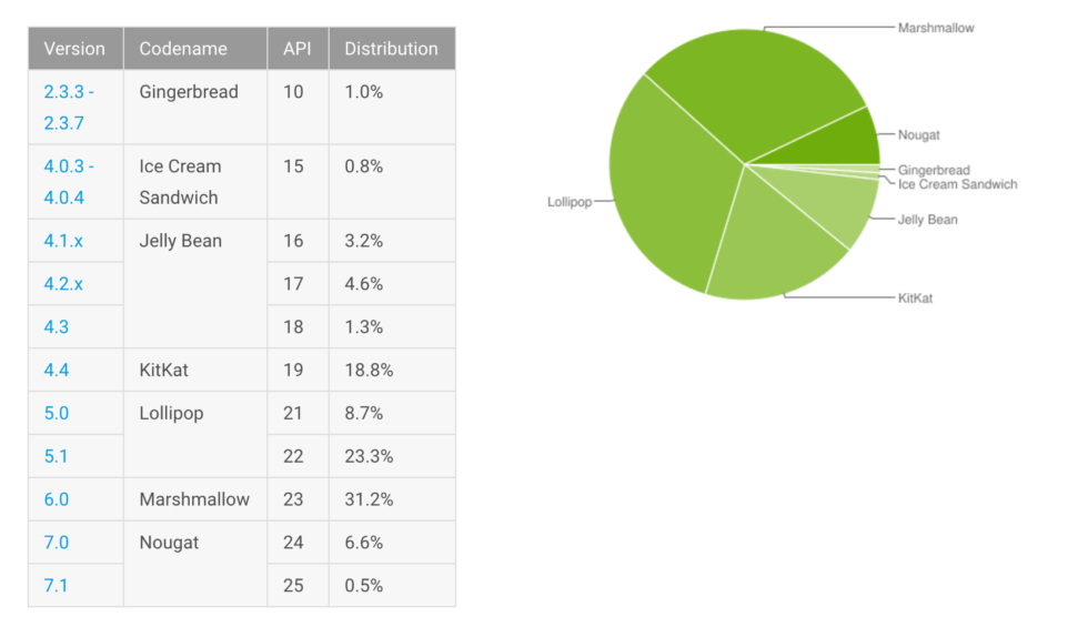 As for the rest of the numbers, Marshmallow hasn’t changed from April, still sitting at 31.2%. The same goes for Lollipop at 31.0%. KitKat saw a slight decrease to 18.8% (down from 20.0%), Jelly Bean down to 9.1% (10.1%), Ice Cream Sandwich to 0.8% (0.9%) and Gingerbread somehow gained users at 1.0%, up from last months 0.9%. Seriously, that should be the headline, “Gingerbread gains users in May, 2017!”