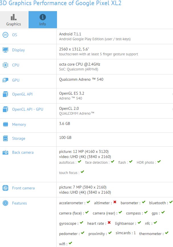 According to a listing from GFXBench, a popular benchmarking tool that all upcoming devices seem to go through, the Pixel XL 2 shares a few specifications with other 2017 flagships. Keep in mind, though, we aren’t 100% on whether any of this info is accurate.