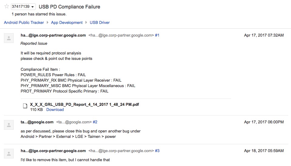 In a bug report filed to the Issue Tracker, you can see where an LG representative is having an exchange with a Googler over a USB driver problem. While the LG rep doesn’t mention the device, the Googler sure does by recommending the bug be filed under “Android > Partner > External > LGE > Taimen > power.” Well then.