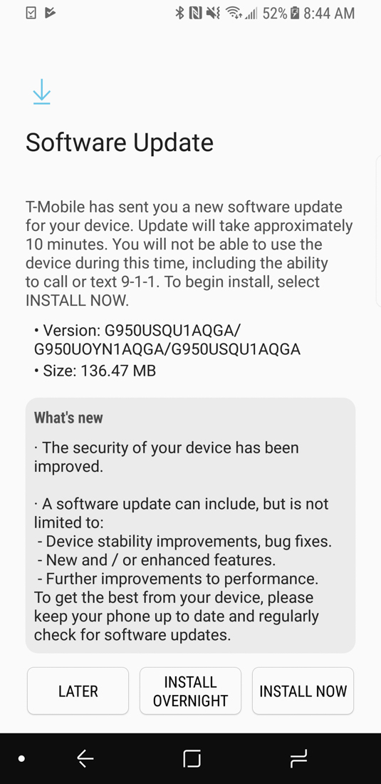 T-Mobile says the new software versions are G950USQU1AQGA (S8) and G955USQU1AQGA (S8+) and that you should also expect a “UMTS 911 update.” That’s it.