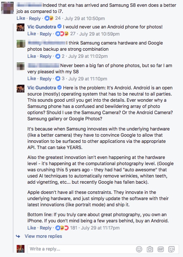Gundotra explained that the problem with Android cameras is Android. His logic involves something around Android being open source and that it has to be neutral to all parties, which leaves you with Samsung’s “confused and bewildering array of photo options,” like the choice between the Samsung camera and the stock Android camera or Samsung’s Gallery and Google Photos. He then tries to explain that there are issues where API improvements take years to push out to various apps causing innovation to slow. He even suggests that Google was “crushing” these departments a few years ago (when he was there, of course), but has now fallen back. He finishes by saying that if “you truly care about great photography, you own an iPhone.”