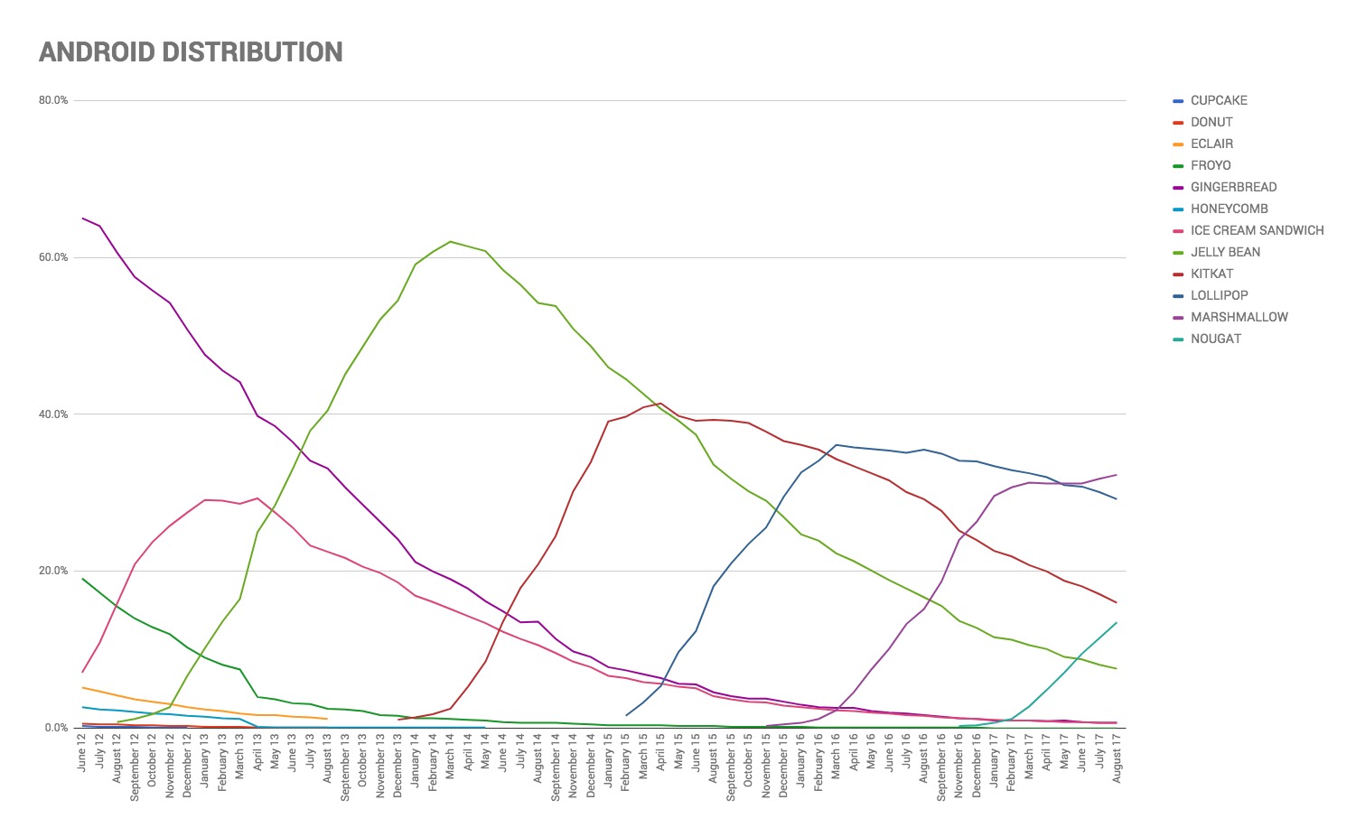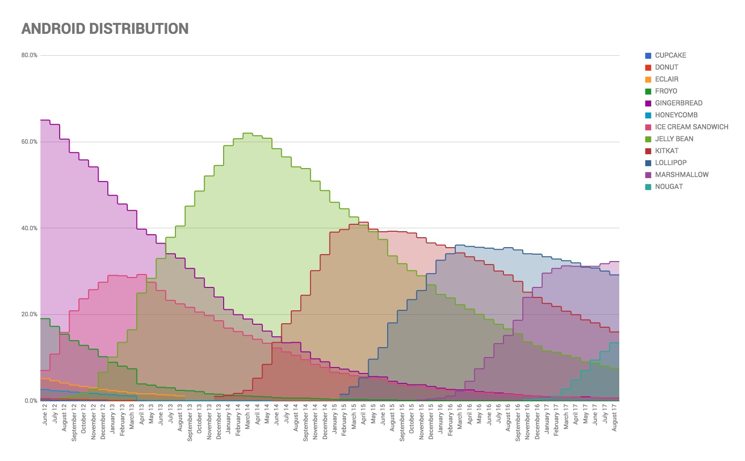 Yesterday’s Android distribution numbers should be the final numbers released before Android O goes stable and starts rolling out to Nexus and Pixel devices, as well as manufacturers who want to get updates ready for their own phones. We included a small chart in that post that showed the past year of data from Google, but decided to come back today with all of it dating back to June 2012 (We went back to June 2012 because that’s as far back as Google began sharing this information.). That’s right, we’ve got a couple of small charts below that shows you Android distribution (the percentage of specific Android builds at any given time) for the past 5 years.