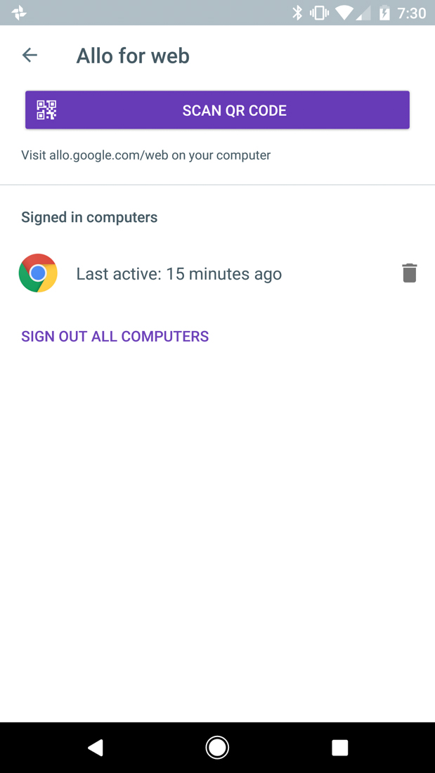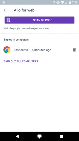 12. Need to remove your Chrome connection? Easy, just go back into the Allo Android app, swipe out the navigation menu, tap again on “Allo for Web,” and you’ll see all of the instances that you’ve signed in. Tap the trash can next to each one individually to sever that connection. Or you can “Sign out of all computers.”