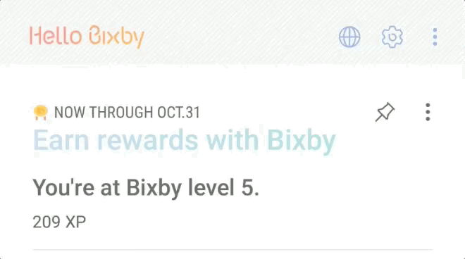 - Once done, you’ll want to scroll all of the way up to the top of Bixby until you see the three icons to the right of “Hello Bixby.” They should look like the icons in the GIF above, with a globe icon, settings gear, and 3-dot menu.