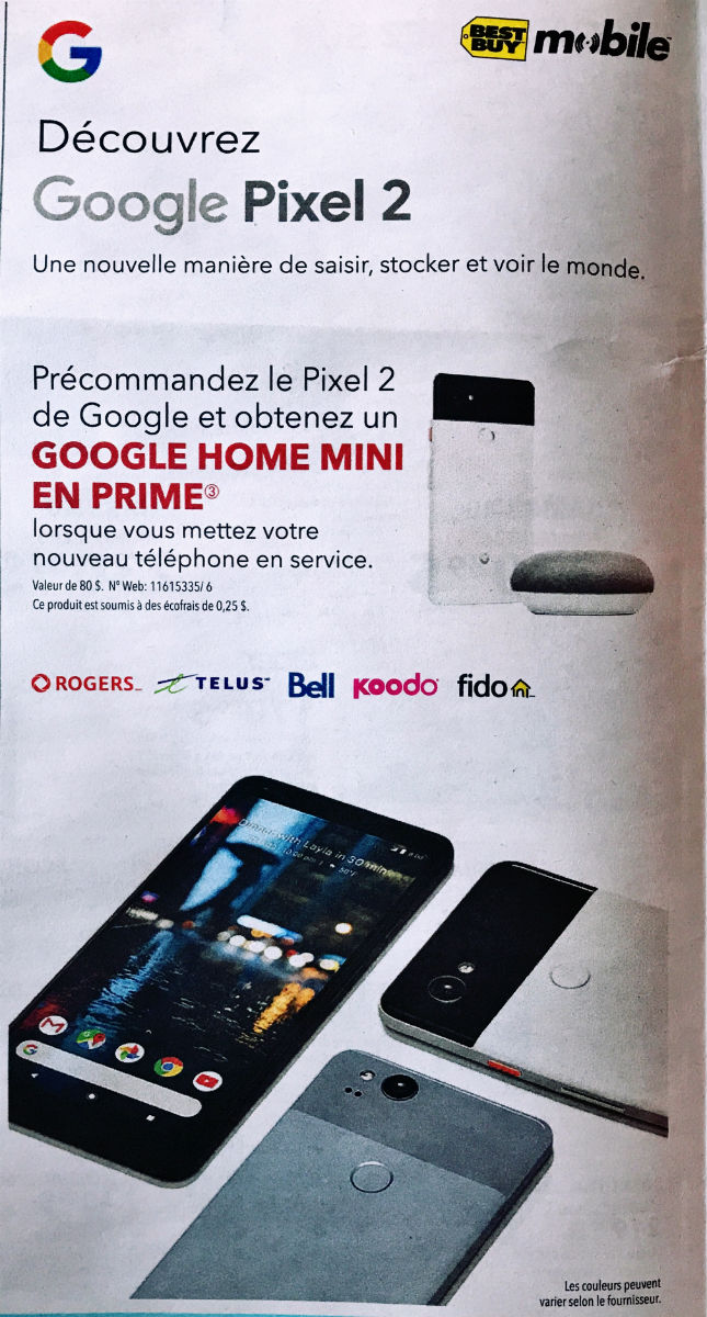 According to next week’s Best Buy newspaper insert/flyer, if you pre-order a new Google Pixel 2 or Pixel 2 XL, they’ll hand you a Google Home Mini for free. At least that’s what the translation from French to English is telling us in an image posted over at reddit.