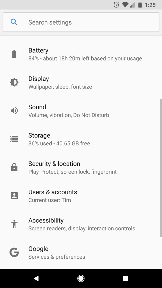 The Pixel 2’s 5-inch FHD display is fine, but nothing to get overly excited about. It’s a basic AMOLED panel, with decent colors and support for Always On software. I’ve had a few people ask if colors seem muted or tinted at all, and thankfully, I haven’t had any complaints in that department, but if you’re comparing it to the display on the Galaxy S8 or LG V30, you will see big differences. The colors just don’t pop as much as they do on those other phones, even with the option for “Vivid Colors” enabled under the settings menu.