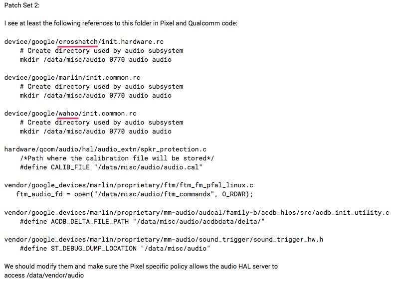The reference to “crosshatch” is in the same breath as if it were a part of Google’s device line-up (or future line-up), specifically the Pixel line-up. The page discusses both “sailfish” and “marlin” on numerous occasions (those are the original Pixel and Pixel XL), plus the comment we care so much about says that “crosshatch” and the audio files under discussion were a part of “Pixel and Qualcomm code.” That’s certainly not definitive proof that “crosshatch” is a new Pixel phone, but it matches up to info provided to us.