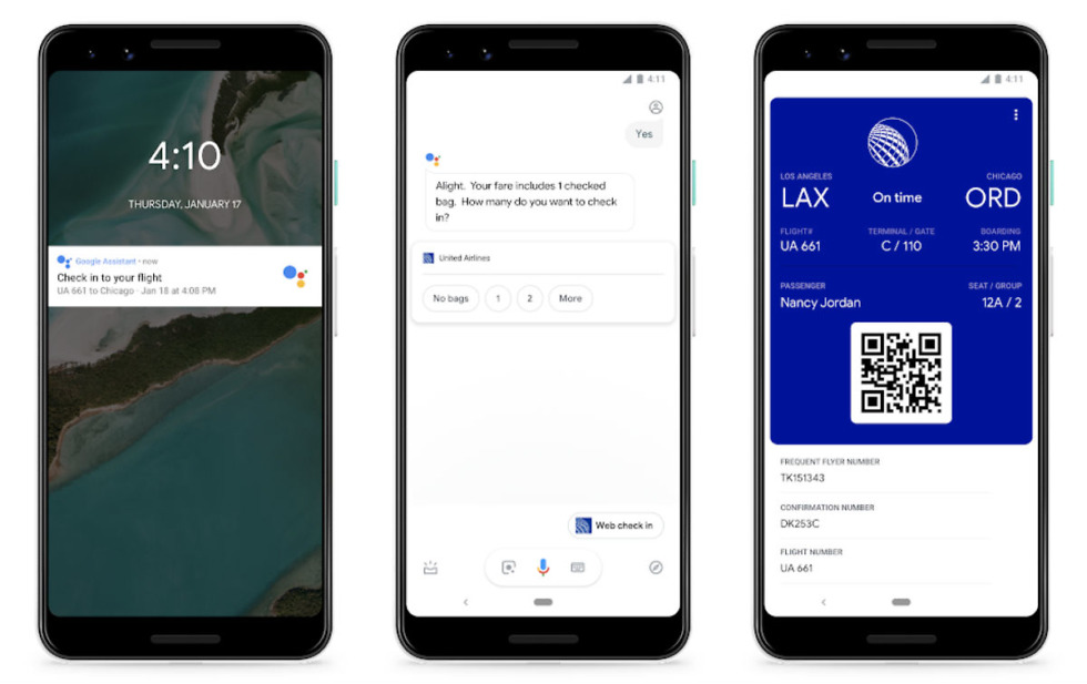 Said to be coming very soon, if you book a United flight and the itinerary is in the Gmail account associated with your Google Assistant, Assistant will automatically let you know when it’s time to check-in for your flight. Once checked in, you can get your boarding pass right in Assistant’s interface, then continue on your way to an overbooked flight where you’ll undoubtedly be forcibly removed from the plane, resulting in what could be a very lucrative settlement. Not bad, not bad!