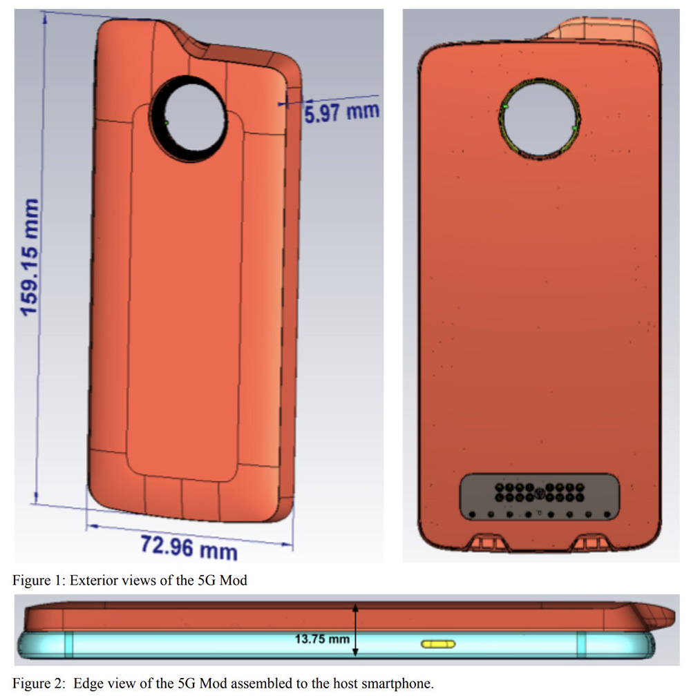 As for testing, the FCC lists out the bands they looked at from the Moto Mod, including LTE bands 2, 4, 5, 13, 66, and 48. For 5G, they tested 5G NR n261, which is 28GHz millimeterWave (mmW) 5G. We knew the 5G Moto Mod would connect to Verizon’s mmW 5G, as well as LTE, so this all makes a lot of sense.