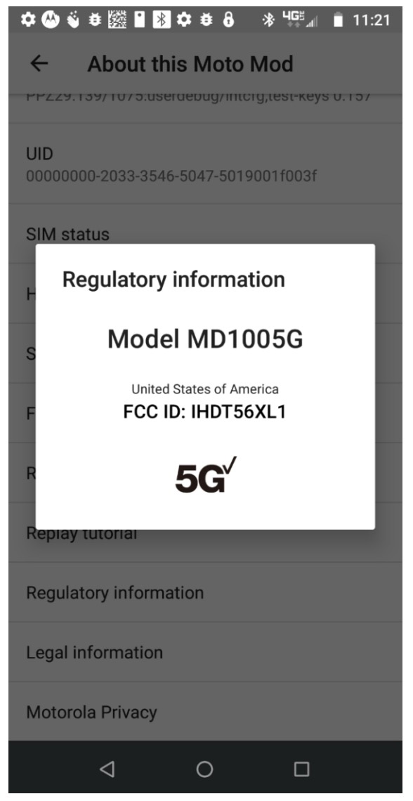 In the image directly below, we get a screenshot of the 5G Moto Mod’s regulatory information screen, which is a part of the Moto Z3’s settings screen for Mods. The screen lists it as model “MD1005G” and references it being a Moto Mod.
