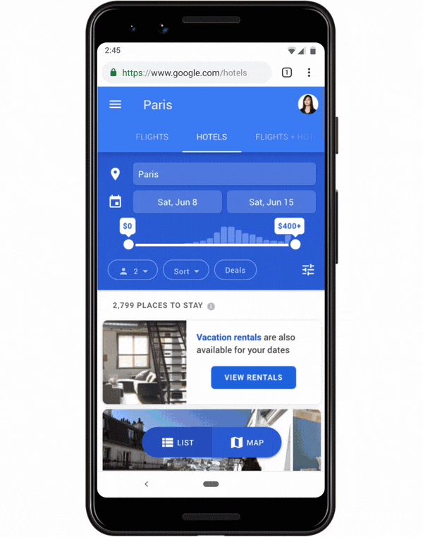To explain, when searching through hotels on your phone through google.com/hotels, users can opt to include vacation rentals, such as cabins near Lake Tahoe or beach houses in Sydney. You can search by price, amenities, plus a whole lot more.