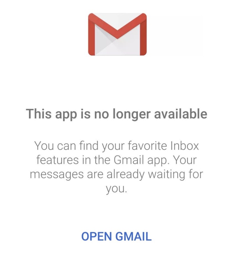 UPDATE: Both services are basically now dead. Google+ personal pages now all redirect to a page telling users that G+ “is no longer available.” For Inbox users, some web access is available, but the app is dead, with a message that says “This app is no longer available” and that users should open Gmail.
