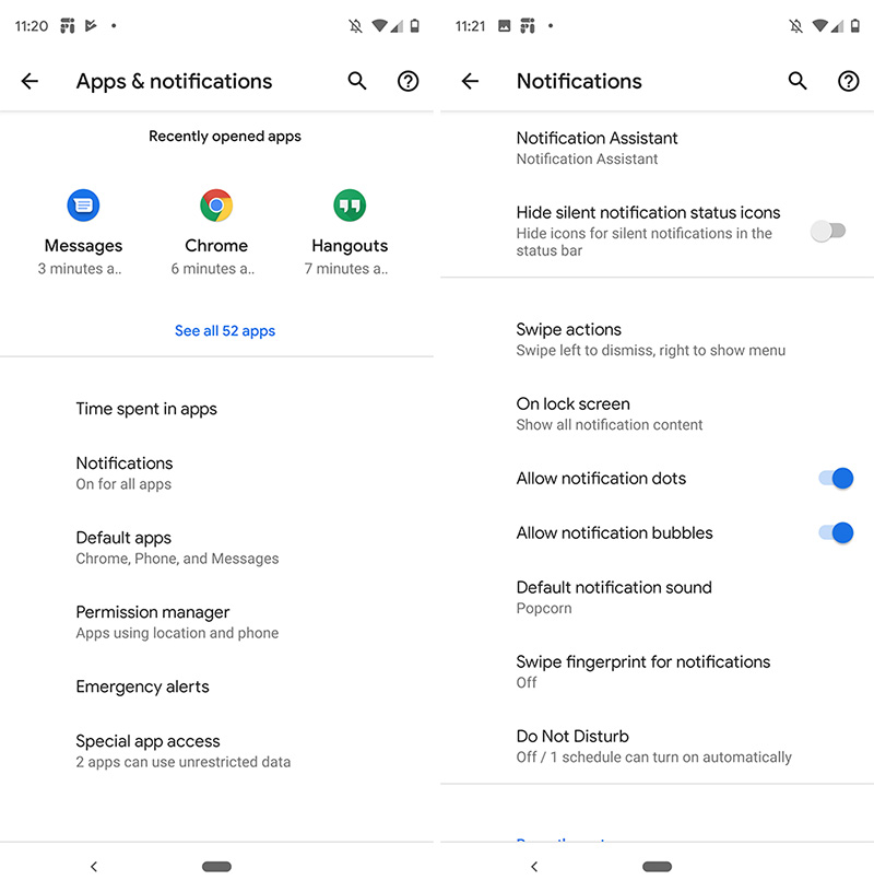 The settings page for notifications has changed layouts some, with less recently opened apps showing. You’ll also find the setting for Bubbles here. We’re still trying to figure out what in the hell a “Notification Assistant” is too.