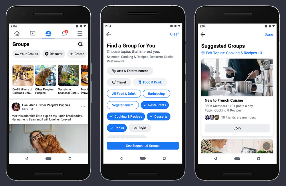 But the big focus is in Groups. Facebook really wants you to care about Groups. They are making it easier for you to discover groups, participate in groups, and all sorts of specific features depending on the type of group. The new UI for all of that can be seen below.