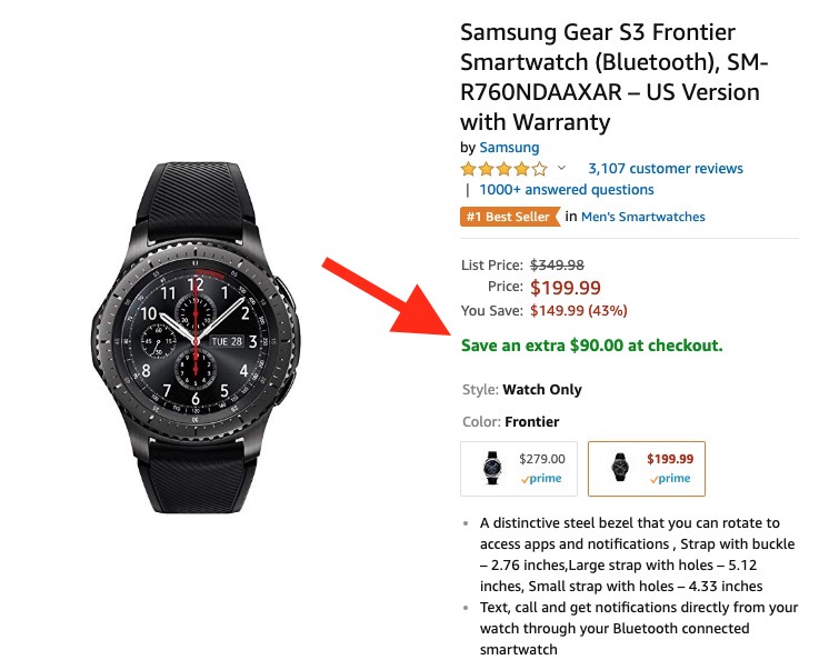 Smartwatch shoppers, we’ve got a sweet deal for you today. Samsung’s Gear S3 Frontier watch is down to just $109.99, thanks to an instant $90 off when you add one to cart. $90 off!
