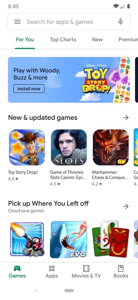 The major change is the addition of a bottom bar for navigation. There are dedicated sections for Games, Apps, Movies, and Books. Previously, these sections were at the top of the app, and honestly, it was a pretty funky UI to navigate. This seems much better.