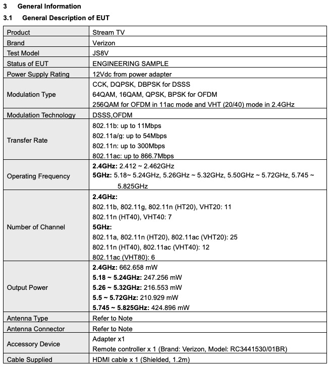 The device (model JS8V) features 802.11ac WiFi, Bluetooth, HDMI, Dolby Audio, and a controller. And again, it’s called the Verizon “Stream TV.” I mean, the name kind of sells it all, right?