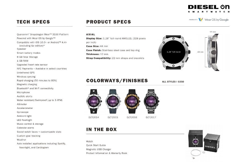 Much like these three brands, the watches differ quite a bit. The Puma Smartwatch is catered more to the fitness folk (it’s a rebranded and redesigned Fossil Sport), the Diesel Axial is for people who like bulkier designs (it’s a rebranded Fossil Gen 5 with a different casing), and the Emporio Armani looks more sleek and comes in a variety of colors (and is also a Gen 5, but in a different casing).