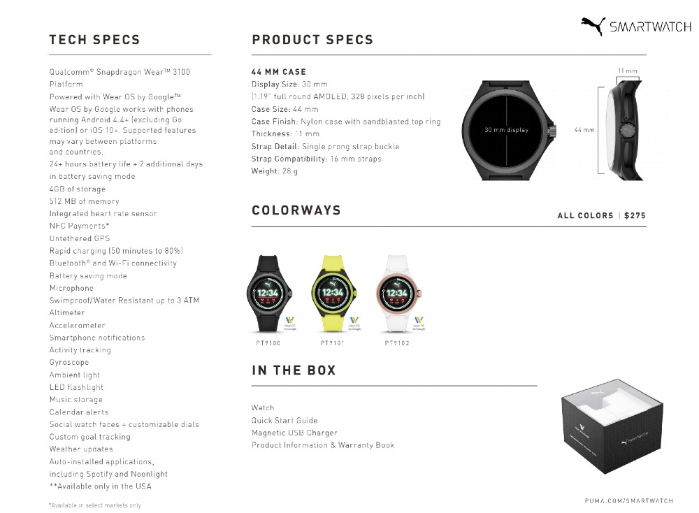 For pricing and availability, the Puma Smartwatch will be available for $275 starting in November. Both the Armani and Diesel will be available in October, with the Armani priced at $275 and the Diesel at $350.