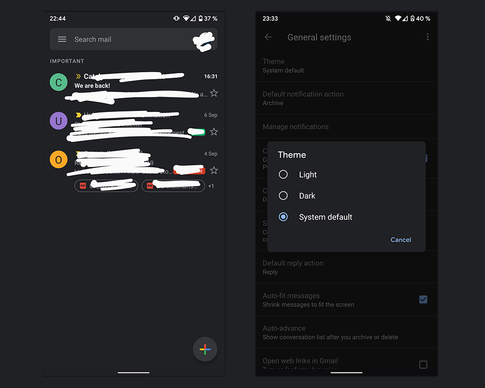 If you update and want to look for it, head into Gmail settings and you should see a “Theme” choice at the top, above your “Default notification action.” Should you tap that, you’ll get options to force Gmail to be light or dark, or you can let it respond to your system theme.